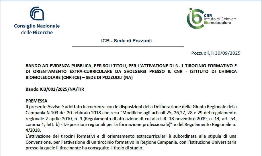 TIROCINIO EXTRACURRICULARE DI 6 MESI RINNOVABILE DI ULTERIORI 6, per la seguente tematica: “Metodi e tecniche di conservazione di microrganismi estremofili” sotto la responsabilità scientifica della dott.ssa Ida Romano.